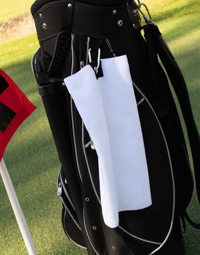 - Microfibre golf towel with rivet and hook detail